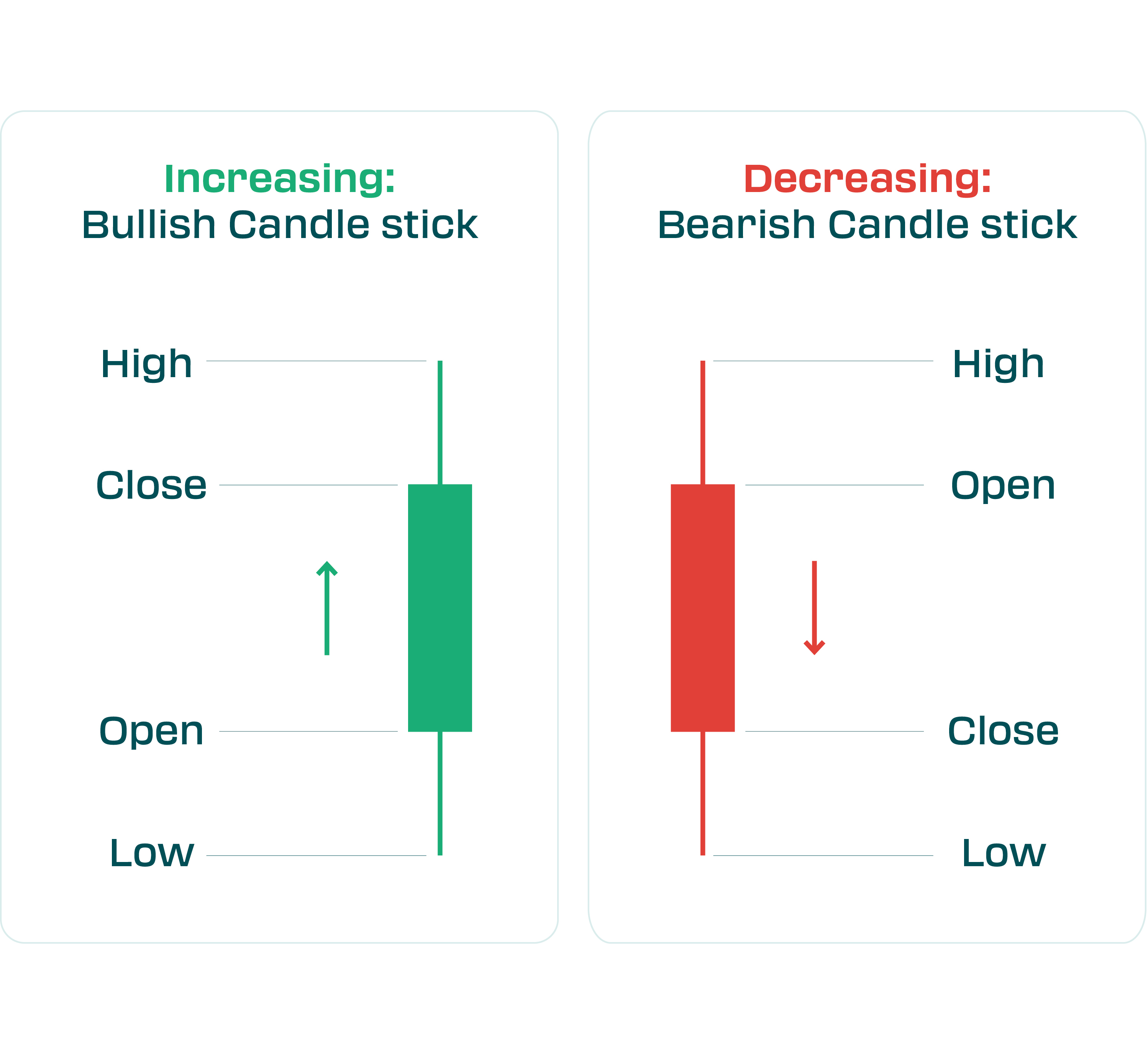 Candlesticks convey the same info as bar charts (open, high, low, close) but in a more visually intuitive way. Each period is represented by a “candle.” The body of the candle is colored (often green for up, red for down) and shows the distance between open and close. Wicks (thin lines) extend above and below the body to show the high and low. Candlestick charts are very popular among technical traders because patterns in candlesticks (like doji, engulfing patterns, etc.) can offer quick insight into short-term sentiment shifts. For example, a long upper wick might indicate that price tried to rally but met selling pressure, potentially a bearish sign.