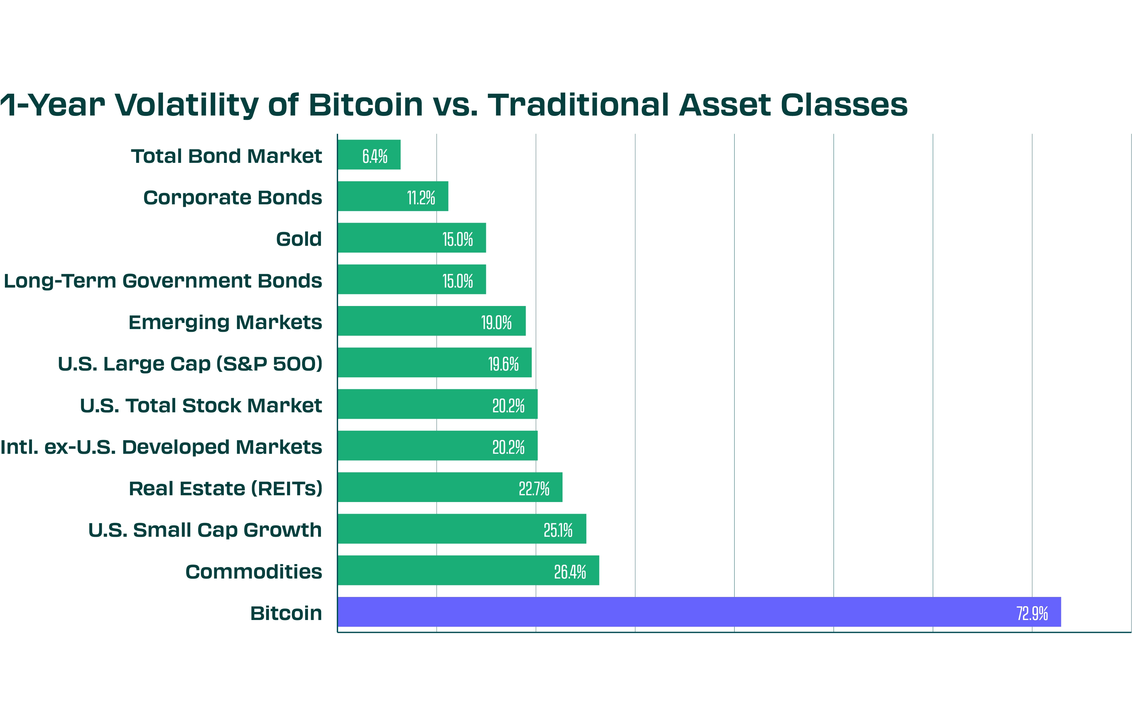 The chart above illustrates Bitcoin’s historically high volatility compared to traditional markets. As the asset class is still relatively small, even moderate news can trigger large price swings, but over time volatility may decline as crypto markets mature.